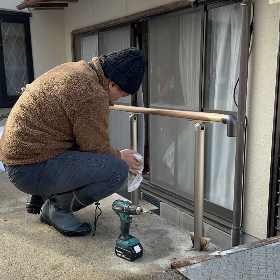 勝手口を出たところに階段があり足元が不安定になりやすいため、手すりを設置して安全性を高めていきます💡👷‍♂️